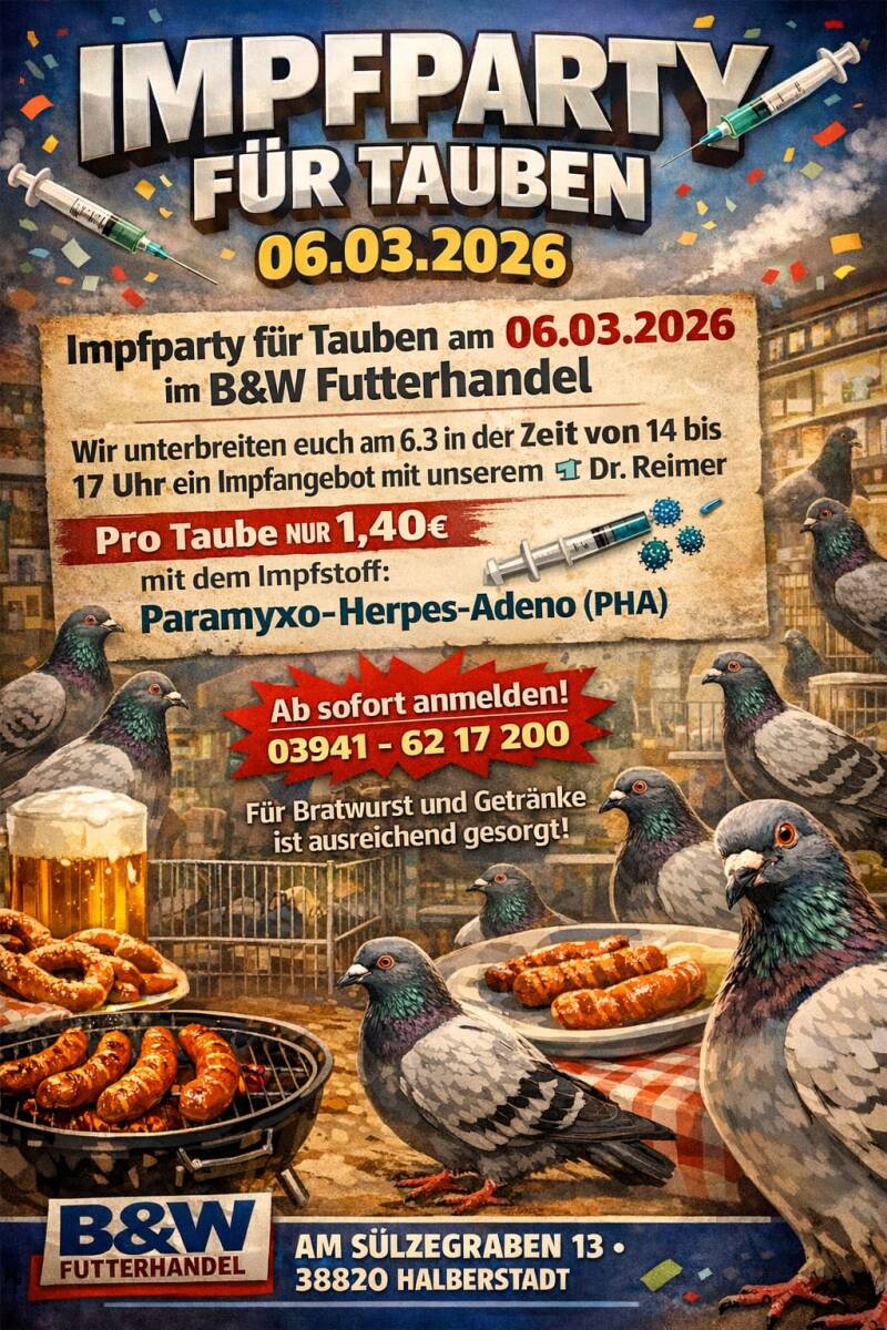Bitte beachten Sie, dass der Versand für Bestellungen unter 50€ mit 6,50€ berechnet wird. Für Bestellungen über diesem Betrag ist der Versand kostenlos. Bitte dann im Warenkorb den Code TAUBE eingeben!(ausgenommen vom Postversand ist Taubenfutter) Wir legen großen Wert auf eine zuverlässige und schnelle Lieferung Ihrer Bestellungen.
